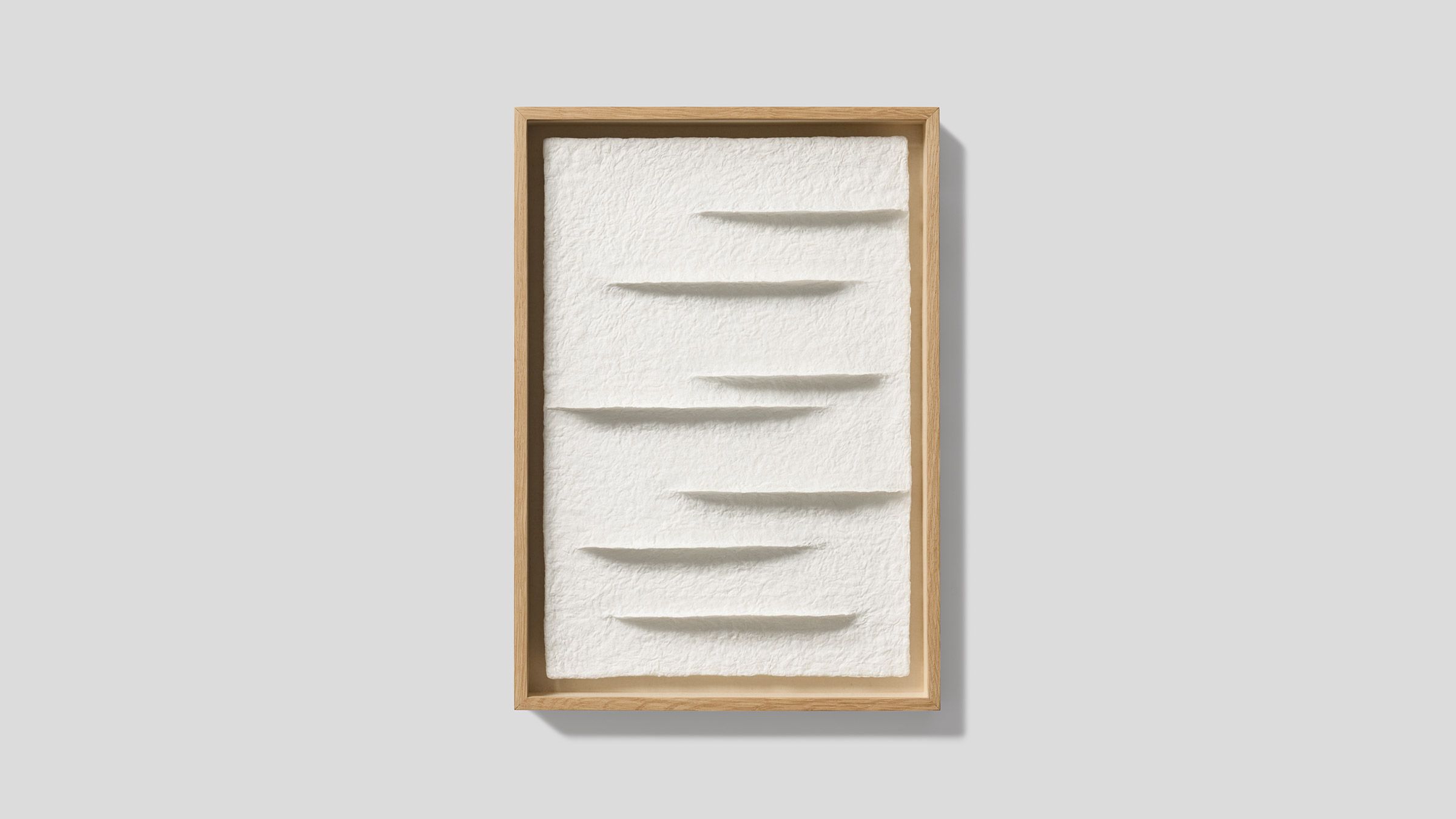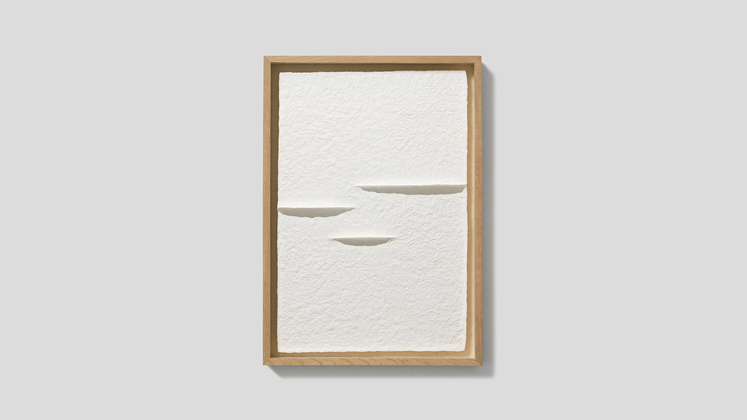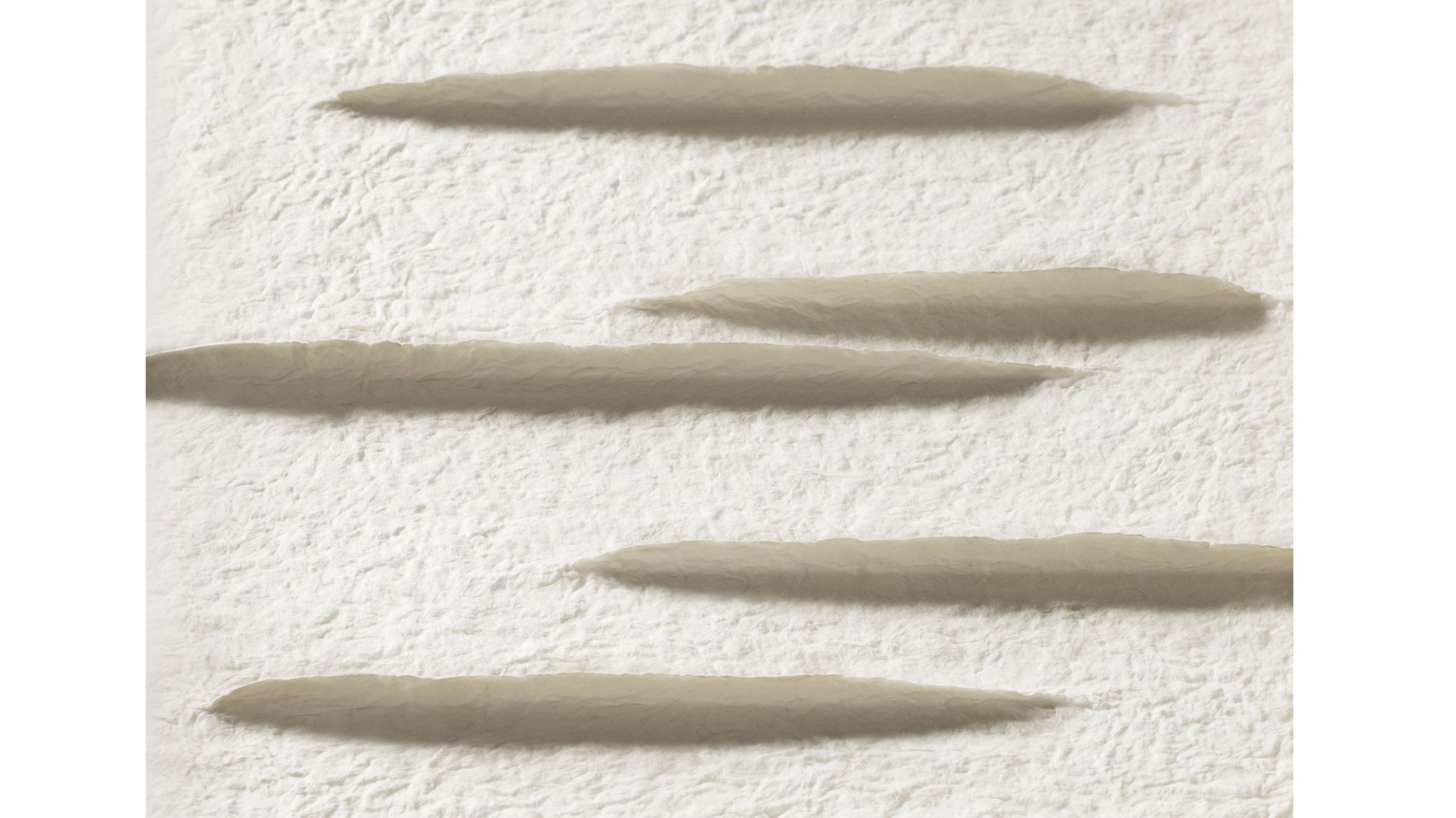 Polar is a series of Hanji reliefs that emerges from this sensory association. Built through the accumulation of mulberry fibres, the raised structures suggest mountainous topographies. From the front they appear almost linear, yet when light falls and shadows form, their three-dimensional landscape gradually reveals itself. As in nature, form becomes visible through light; the work is completed in illumination.